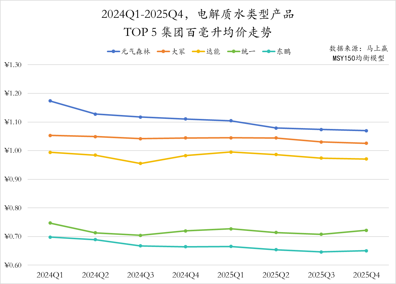 2024Q1-2025Q4,电解质水赛道 TOP5 集团在趋向稳定的同时形成价格带分层:元气森林、大冢以及达能价格稳定在每百毫升在 0.90-1.20 元之间,统一与东鹏则处于每百毫升价格为 0.60-0.80 元的区间,主打性价比。