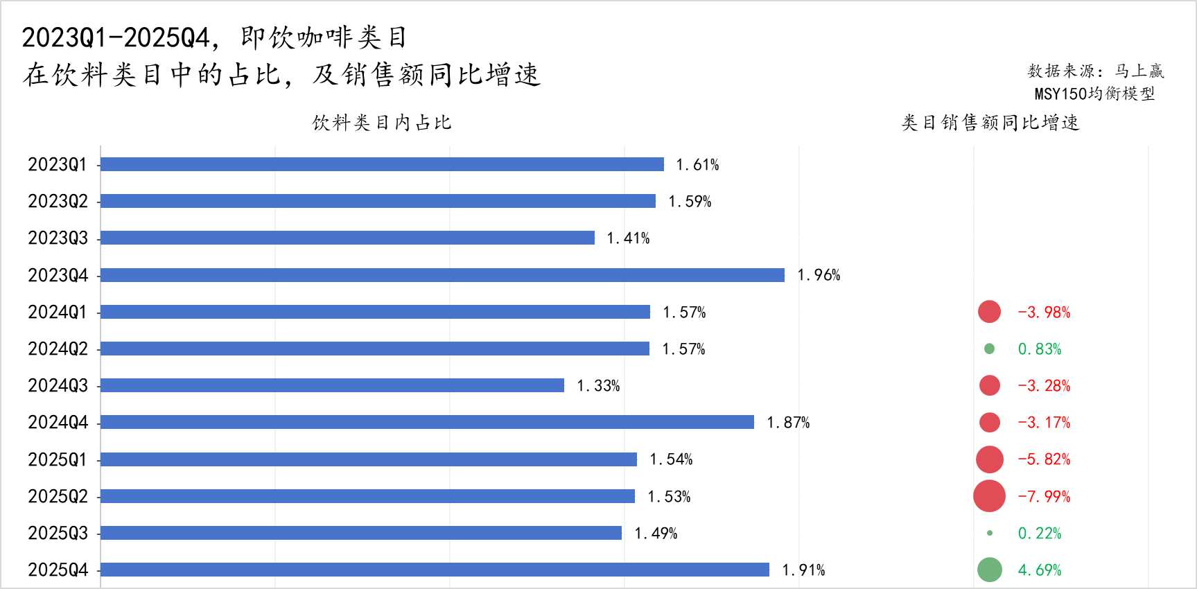 2023Q1-2025Q4,即饮咖啡在饮料大盘中的占比始终维持在 1.3%-2.0% 之间,以每年 Q4(秋冬) 为销售旺季,份额变化呈明显的季节性,与其他解暑、解渴为主要功能的产品有着明显的季节。
