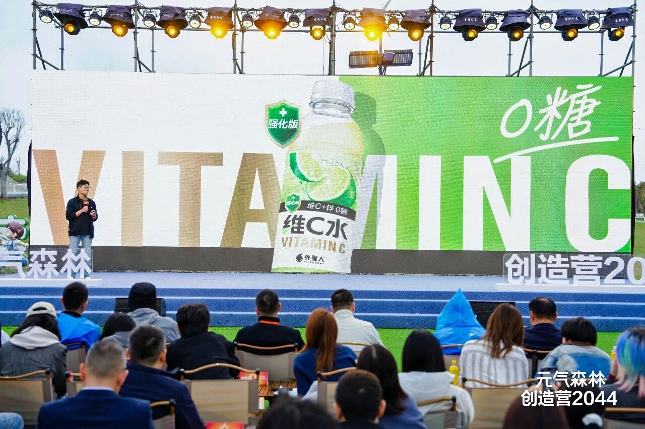 「创造营 2044」 上,营养素饮料方向,元气森林又推出了“ 元气森林 newater-维生素水”,采用青瓜柠檬风味和维生素组合,通过“ 比白水多一点,比普通饮料少一点负担” 的“ 水替” 概念,希望成为消费者常伴手边的新选择。已经较为成熟的维 B 水、维 C 水也迎来了版本升级,推出了全新外星人 0 糖强化版 VC 水,其采用 0 糖配方、小青柠风味,搭配 VC 加锌的营养组合,把这件事变得更简单,顺手就能喝,清爽轻负担。