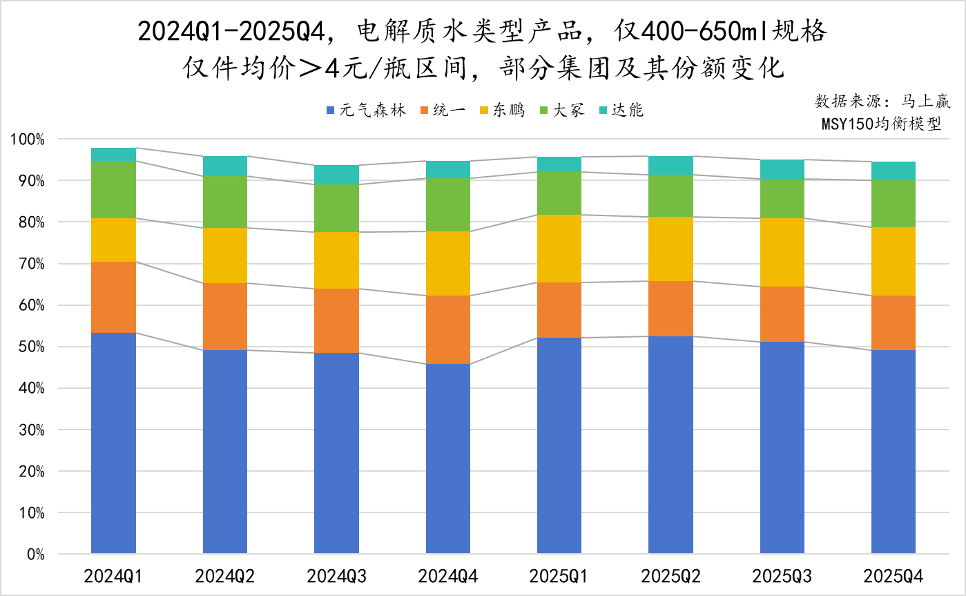 而在件均价>4 元/瓶的“ 中高专业” 价格区间,元气森林始终占据核心地位,季度份额虽有浮动但稳定在 50% 左右。市场份额上,元气森林与统一、东鹏、大冢、达能各分半壁江山,共同组成了电解质水类型的 TOP5 集团,各个集团的市场份额占比变化不大,整体均较为平稳。