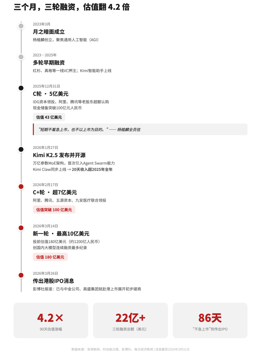 2025 年最后一天,Kimi 母公司月之暗面的创始人杨植麟在全员信里写下:"我们短期不着急上市,也不以上市为目的"。彼时公司刚完成 5 亿美元 C 轮融资,估值 43 亿美元,账上现金超 100 亿人民币。一切看起来是那么地从容不迫。