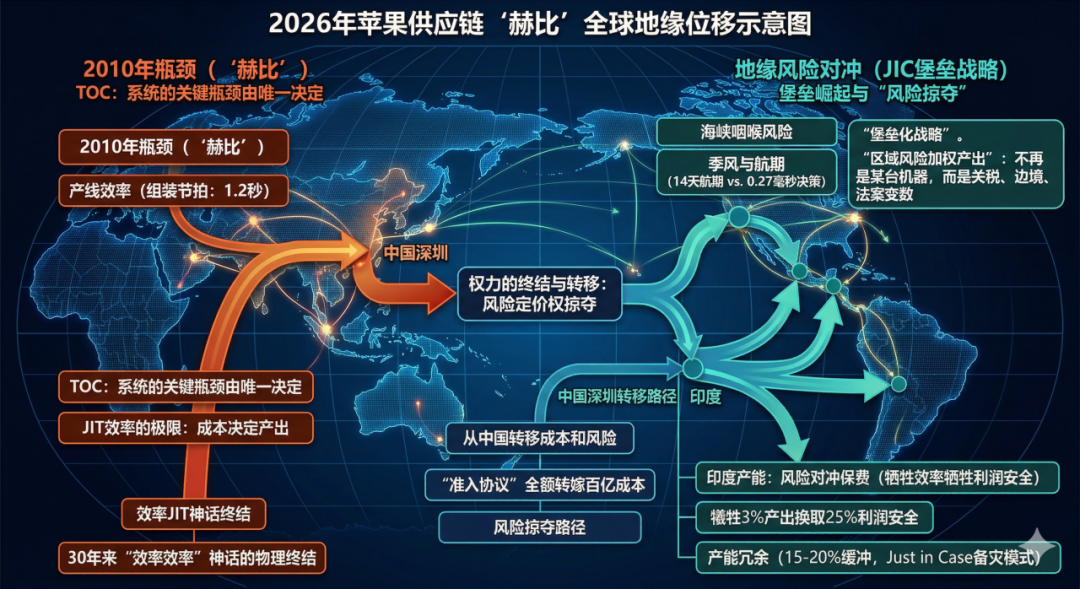 2010 年,库克的赫比是深圳龙华产线上 1.2 秒的组装节拍;而 2026 年,赫比已经发生了物理位移,它不再位于工厂车间,而是漂浮在关税边界、海峡咽喉以及瞬息万变的法案清单里 。库克是第一个意识到“ 生产效率优化” 已进入边际效益递减死循环的人。当物理产线的节拍已经压榨到极致,任何针对非瓶颈环节的提速,在 TOC 语境下都是制造垃圾 。当前的事实是:即便印度 Pro 系列的组装良率被瓶颈卡在了一个尴尬的低位,直接导致有效产出受限,库克依然在加速撤离中国产线 。这背后是一场关于“ 风险定价” 的重新计量:
