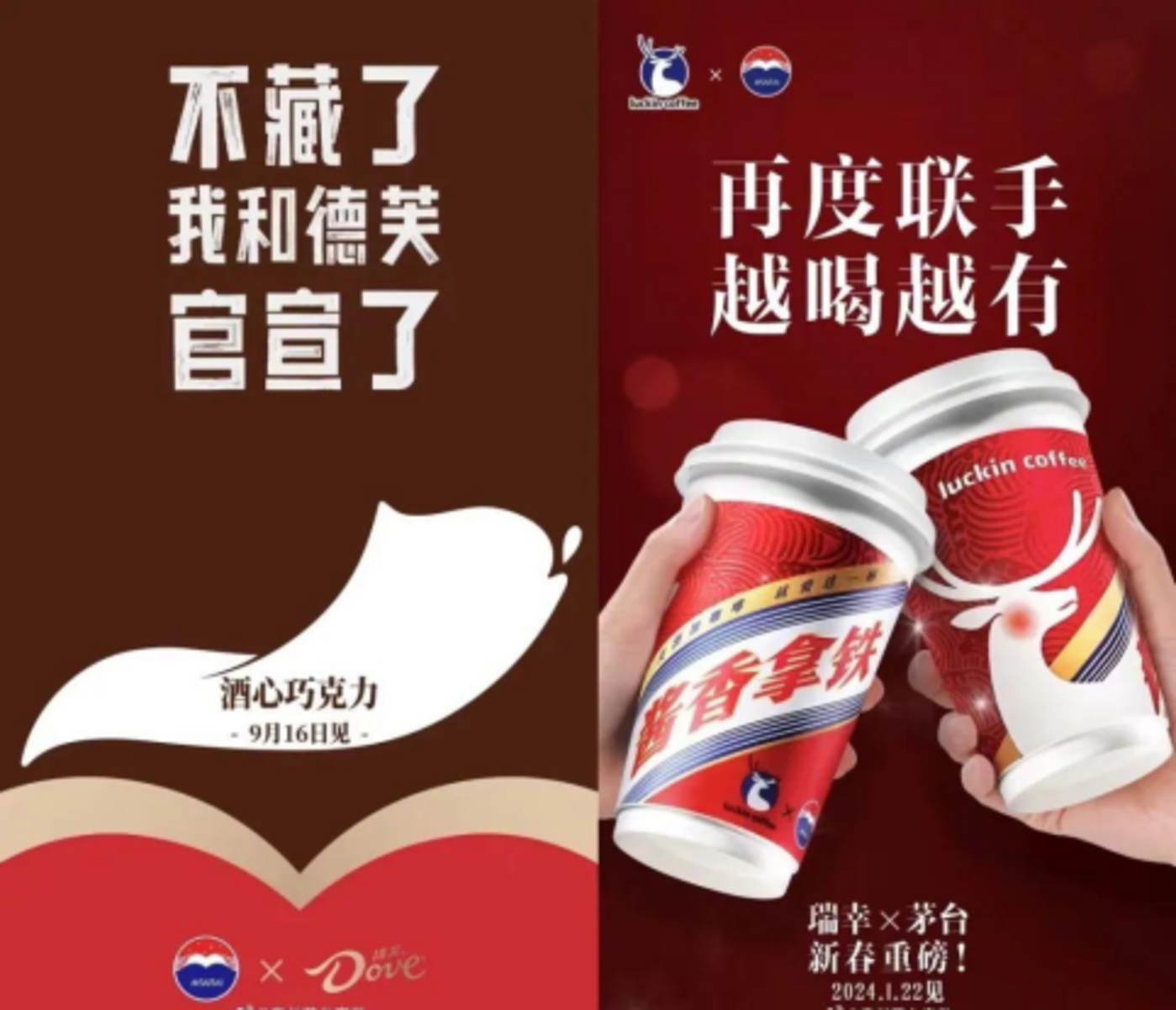 茅台与瑞幸推出酱香咖啡,跟德芙联名推出酒心巧克力;泸州老窖也曾推出 「国仙」 中式果酿酒等品类,还跨界美妆推出 「中国酒粕美妆」。