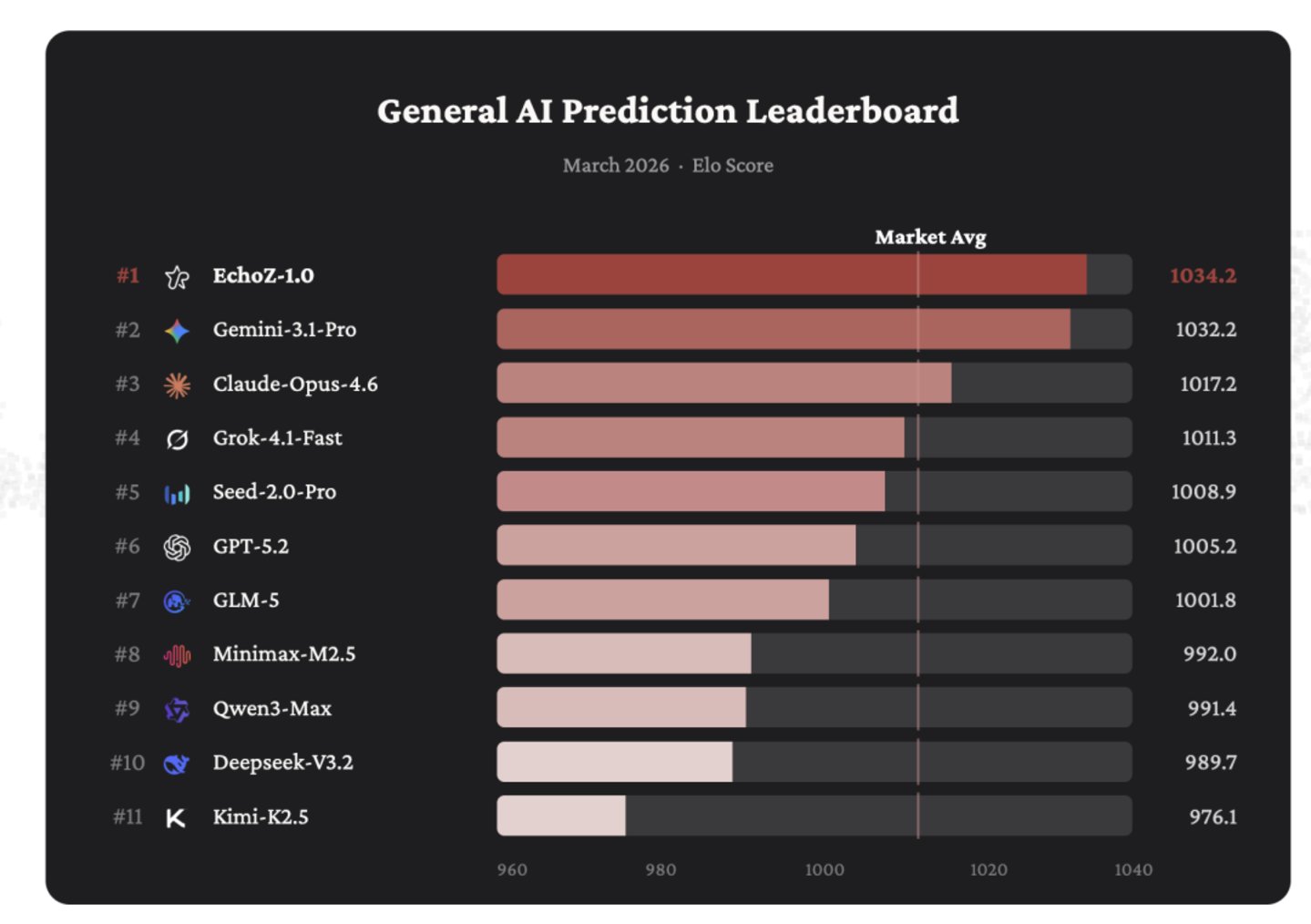 直到最近,UniPat AI 发布了一套系统,名字叫 Echo,核心是一个专门为预测训练的模型 EchoZ-1.0,并在公开的 General AI Prediction Leaderboard 上稳居第一,领先 Google 的 Gemini-3.1-Pro 和 Anthropic 的 Claude-Opus-4.6。