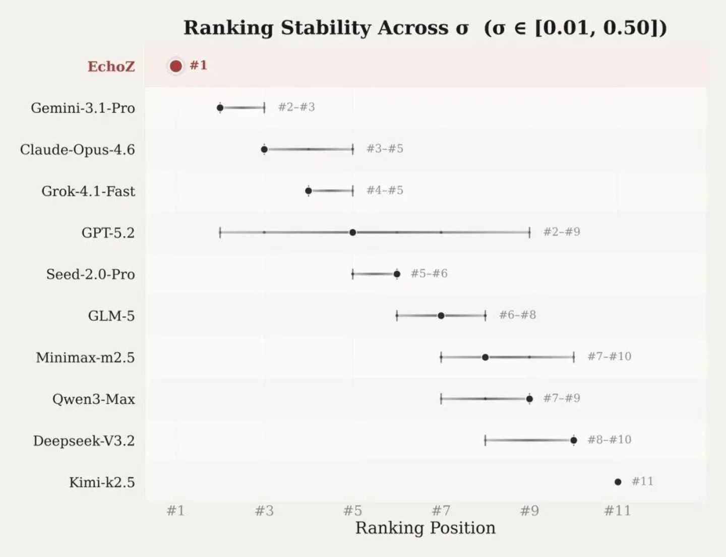 Echo 团队做了一组σ参数敏感性测试:调整 Elo 框架中的一个参数,控制模型之间表现差距会被放大到什么程度,从 0.01 到 0.50 共 9 个取值,重新计算全部模型排名。EchoZ 在全部 9 个分组均保持第一,是唯一排名未发生任何波动的模型。