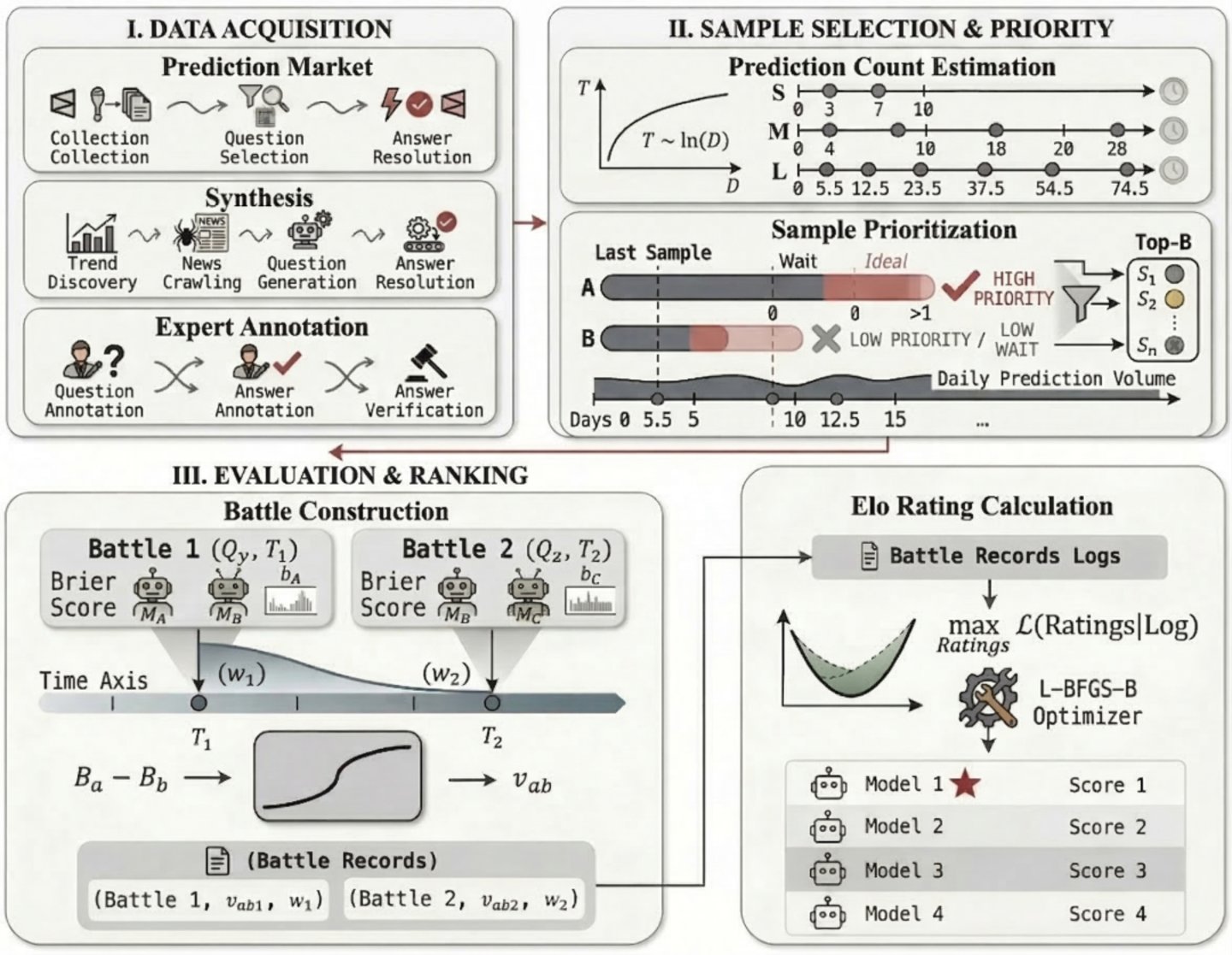 系统会持续从 「三条管道」 吸入新题目,预测市场合约、实时趋势自动合成、专家贡献。每道题不只做一次预测,而是根据结算周期长度分配多个预测时间点。
