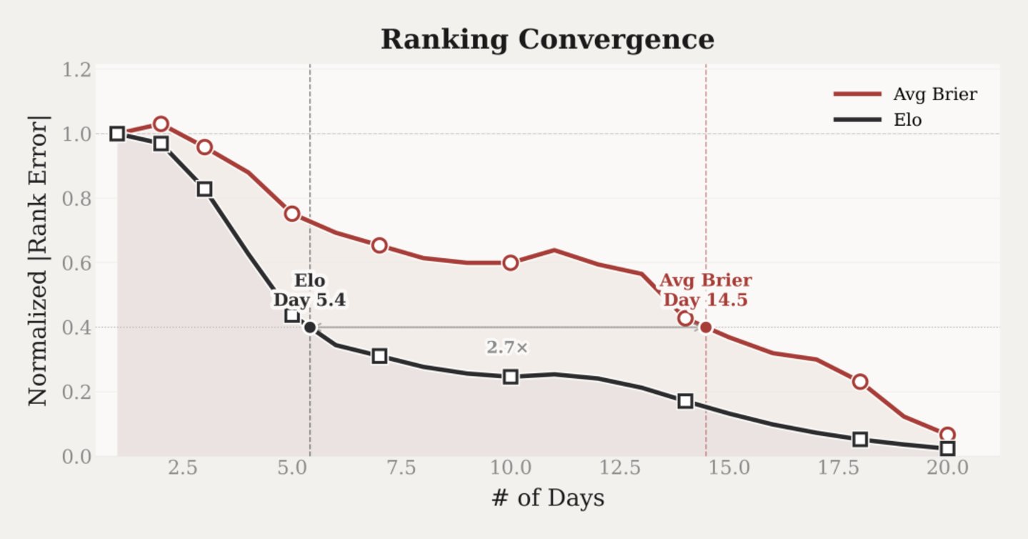 模拟一个新模型刚加入排行榜,看它的排名多久能稳定下来。Elo 在第 5.4 天就收敛到和 20 天后一致的排名,Avg Brier 要到第 14.5 天,快了 2.7 倍。