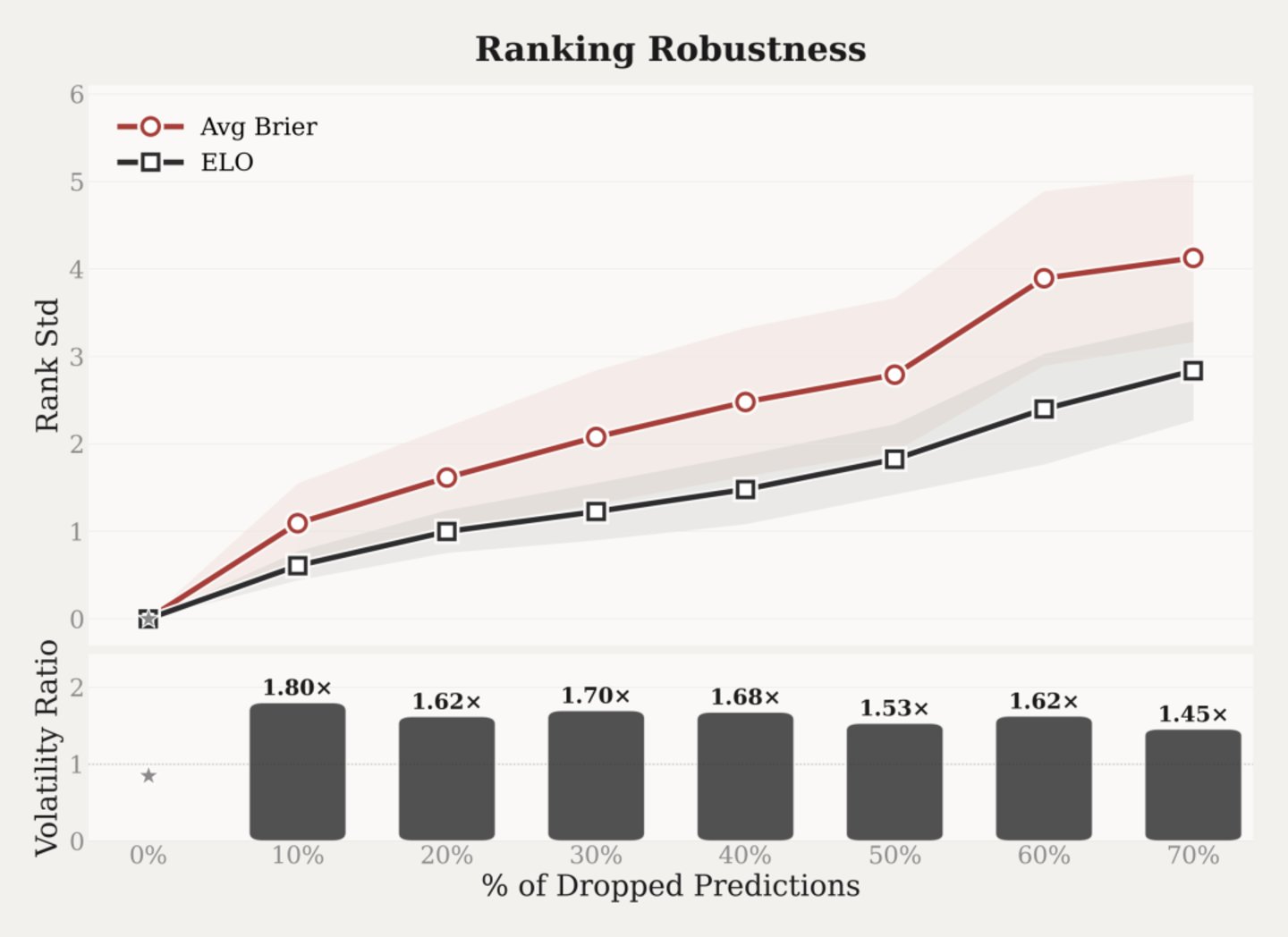 结果表明,Elo 体系下的排名稳定性始终优于传统 Avg Brier 方法的平均排名,前者波动幅度比后者低 1.4 至 1.8 倍;即便数据丢失比例高达 70%,Elo 排名的变动量也仅相当于 Avg Brier 得分排名波动的一半多。