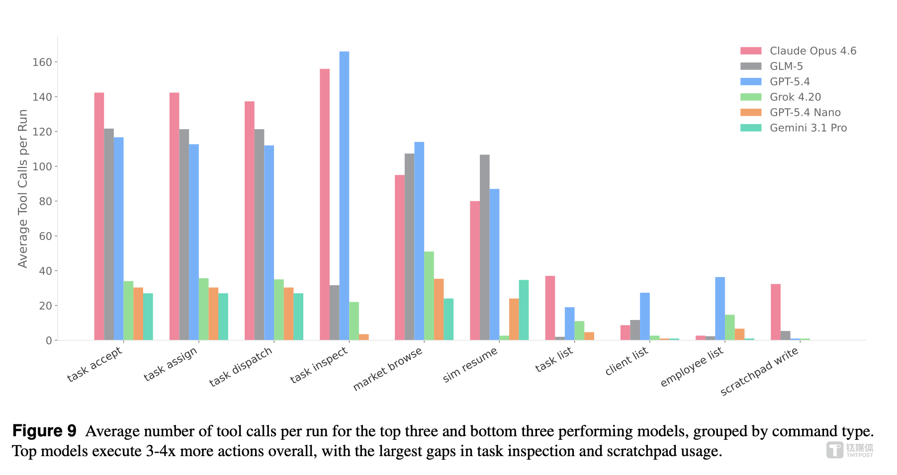 - 首先,运行时间和 Token 量强相关,这意味着 AI 在每个决策回合“ 想了多久”。Claude Opus 4.6 产生了 16.7M token,而 GPT-5.4 Nano 只有 2.0M token。这背后源于两个行为:Scratchpad 的写入量 (记录各种情况) 和每轮发出的命令数 (与环境交互)。