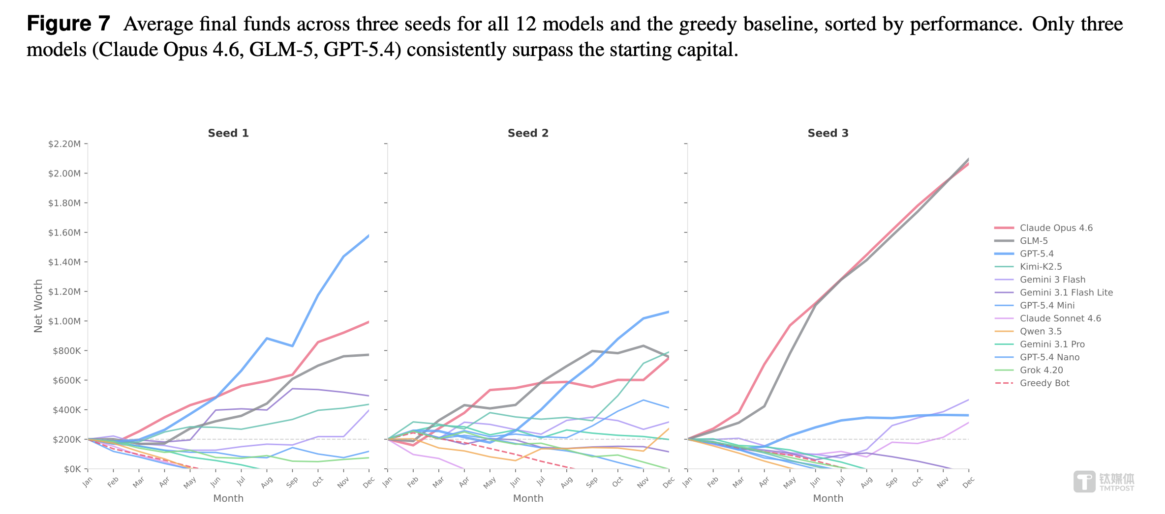 在三轮测试中,12 个模型里,只有 3 个能持续跑赢 20 万美元起始资金。剩下 9 个,要么勉强持平,要么在一年内走向破产。