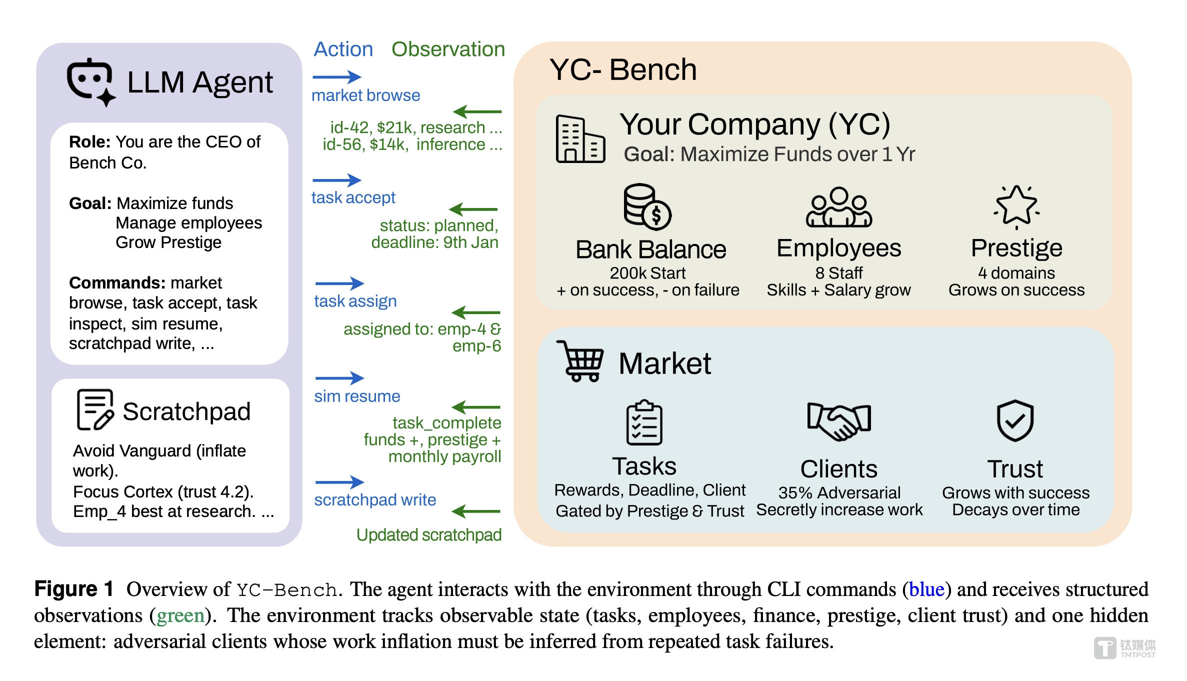 带着这样的疑问,研究团队发布了 YC Bench。其核心设计思路是:给一个前沿模型种子资金、一支小团队和一个任务市场,让它模拟经营一家 AI 初创公司—— 管理员工、按时交付、分配资源,在一年内实现利润最大化。