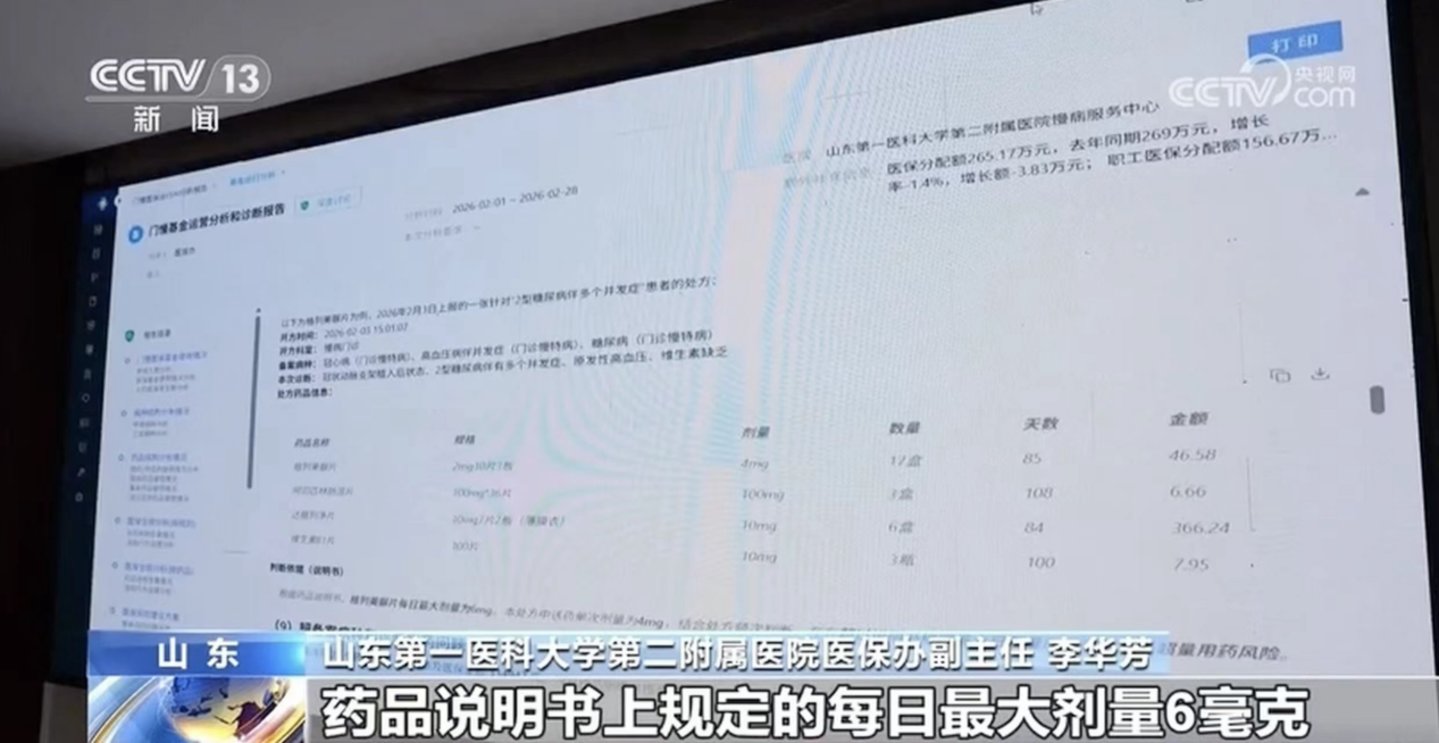 在山东第一医科大学第二附属医院,医保办工作人员正依托月度 AI 分析报告,针对超量用药、重复用药、超适应症用药等问题进行专项通报。「上个月 3 日,慢病门诊给糖尿病患者开出的格列美脲片用量,超过了药品说明书上规定的每日最大剂量 6 毫克,属于超量用药,请查实整改。」