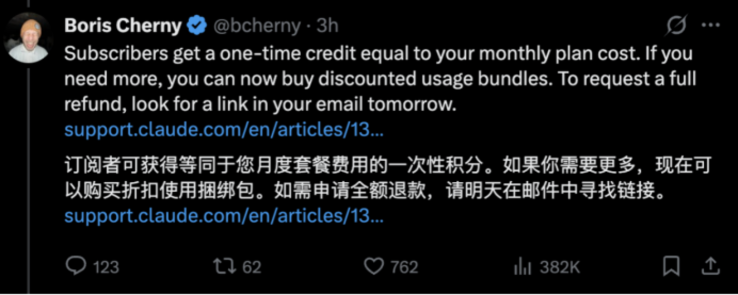 Anthropic 甚至还给出了补偿:订阅者可以获得一次性等额月费积分,折算成你的月订阅费,相当于免费送一个月。