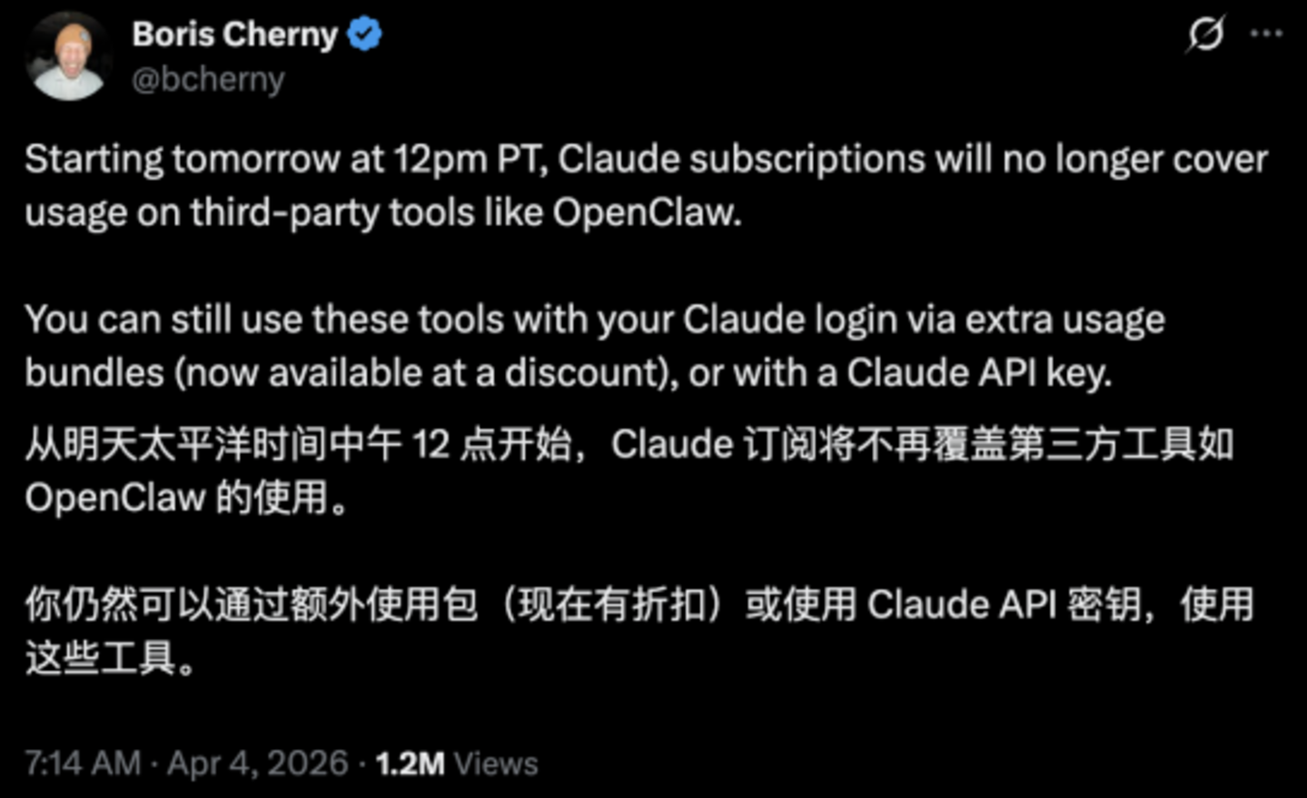 从 4 月 4 日起,你不能再用 Claude 订阅额度跑第三方工具 (比如 OpenClaw),想继续用,只能按量付费。