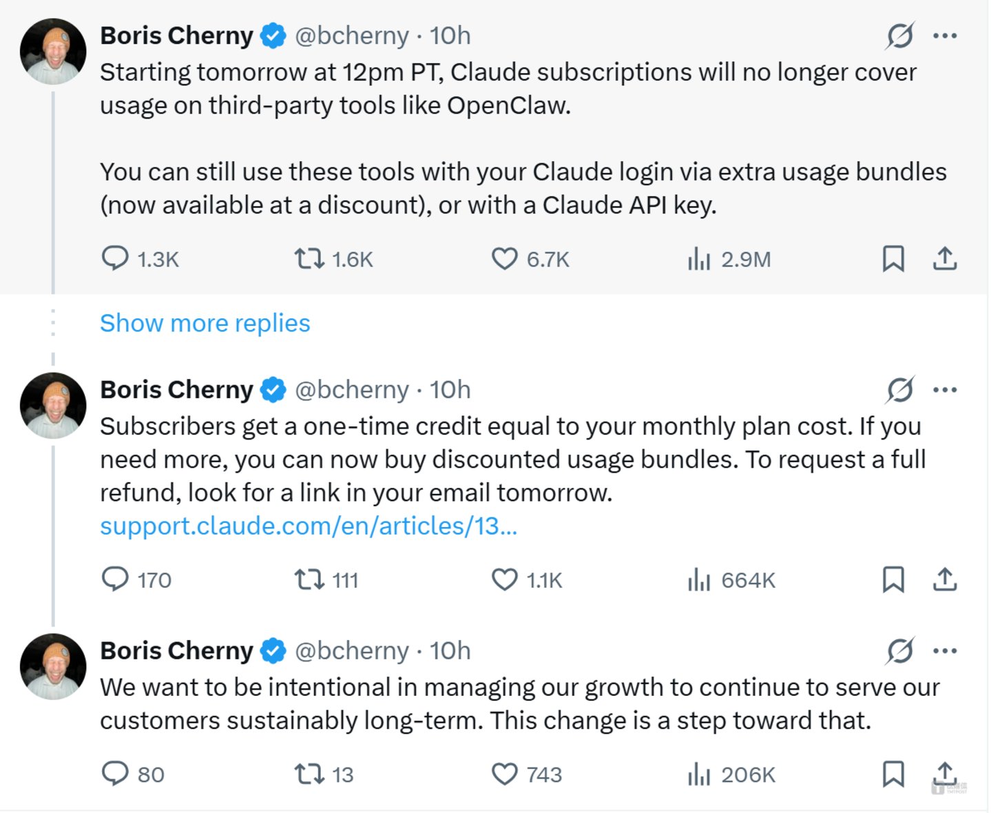 消息由 Anthropic 旗下 Claude Code 负责人 Boris Cherny 在 X 平台首发,四条连续推文宣告了这一政策转向的全貌:容量压力、资源管理、一次性补偿、退款通道——官方的表述滴水不漏,但业内对这一决策的背景早有预判。