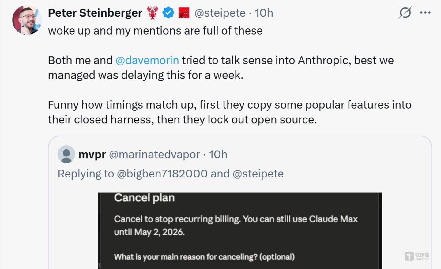• 2026 年 3 月 28 日,Peter Steinberger 携 OpenClaw 董事会成员 Dave Morin 亲赴 Anthropic 总部游说,结果只争取到了一周宽限期;