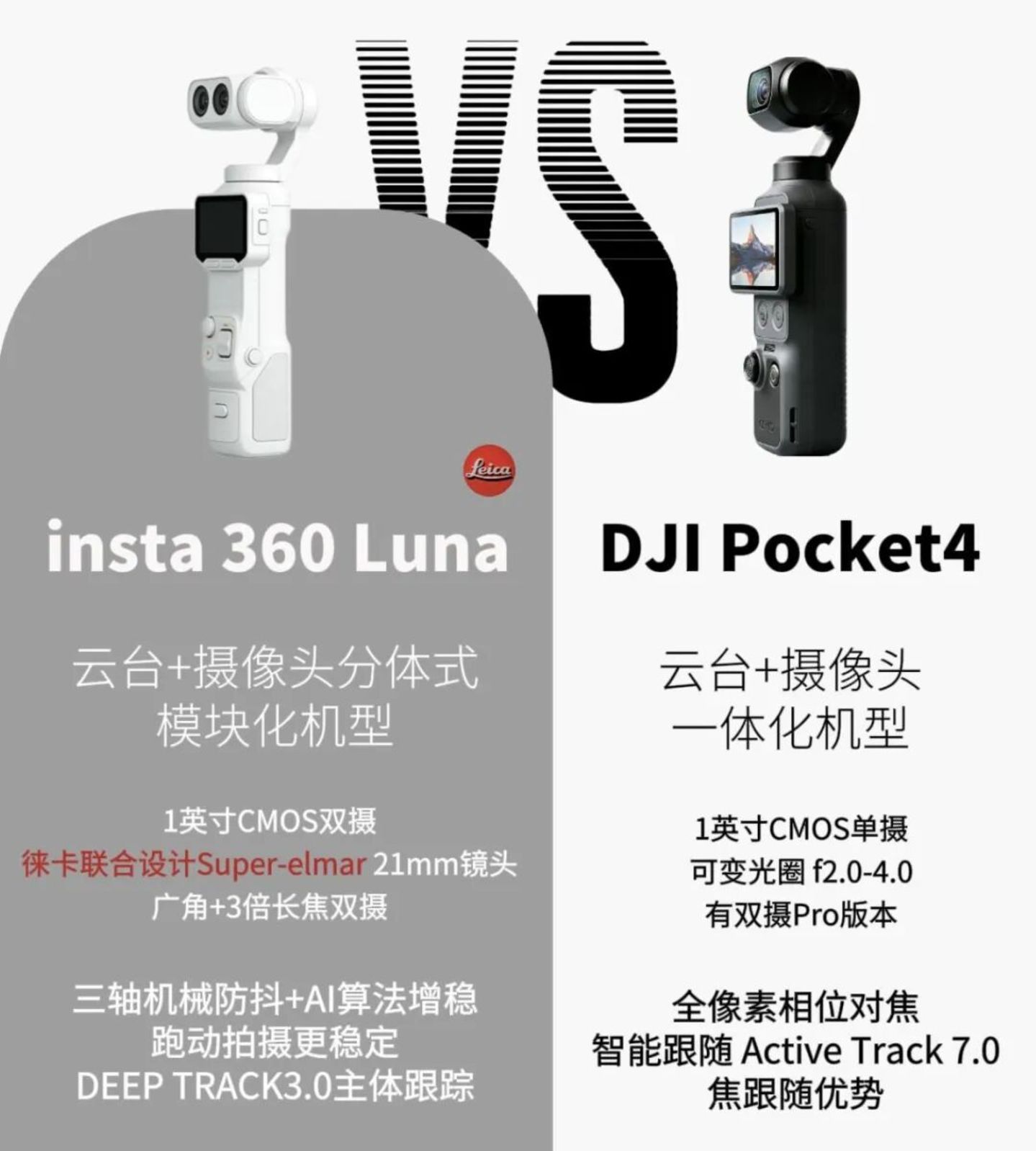 技术路线上,大疆用物理云台防抖,影石用电子防抖+后期算法;产品策略上,大疆做 Pocket,影石就做 Luna,用可更换镜头和 AI 玩法差异化竞争。