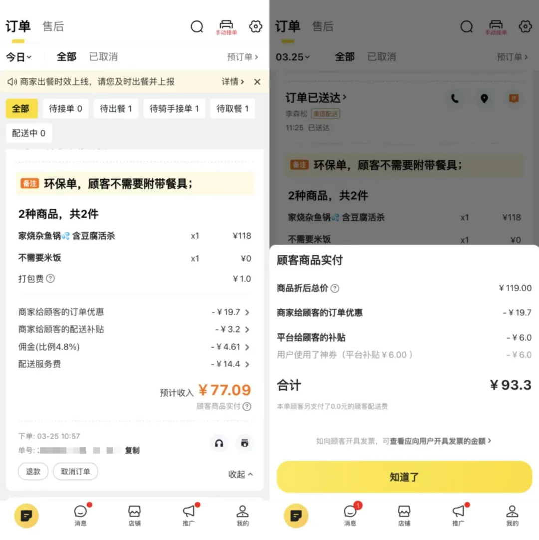 美团商家张启明表示,“ 店里卖 98 元的杂鱼锅,上了外卖顾客用券实付 93.3 元,自己到手才 77 元,现在房租居高不下,各种团购的推广费和补贴都是商家自掏腰包占大头,其实抖音要是能减免抽成让我们有钱赚,谁又会拒绝呢?”
