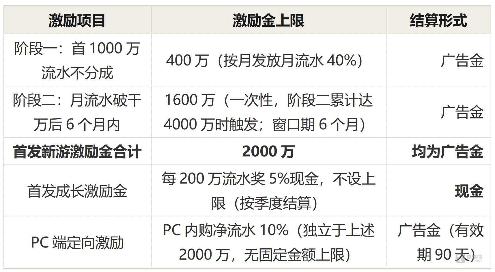 一个值得注意的细节是:阶段二的 1600 万一次性广告金,触发条件是游戏进入阶段二后累计流水达到 4000 万。也就是说,只有当一款游戏的总流水达到 5000 万 (阶段一的 1000 万+阶段二的 4000 万) 时,才能拿到完整的 2000 万激励上限。
