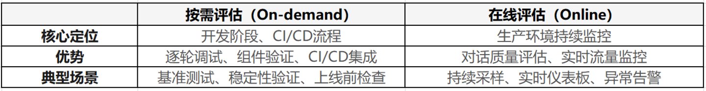 两种模式使用同一套评估器,这意味着你在开发阶段测试的标准,和生产环境监控的标准是完全一致的。不会出现"开发环境一切正常,上线就翻车"的尴尬。