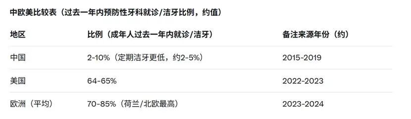中国居民预防性口腔就诊习惯较差,定期牙科就诊率仅约 2-10%。