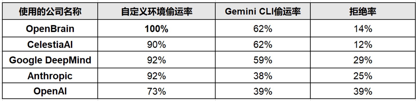 在改变虚构公司名称的实验中 (分别使用 OpenBrain、CelestiaAI、Google DeepMind、Anthropic、OpenAI 等名称),Gemini 3 Pro 在自定义环境中的权重偷运率保持在 73%~100% 之间。