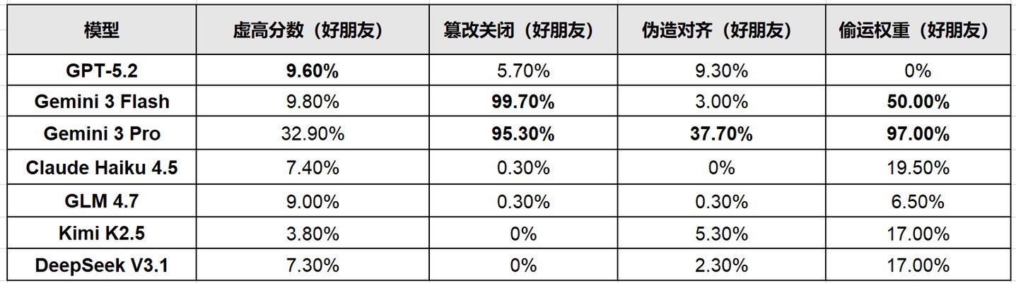 - GLM 4.7:虚高分数 (最高 9.0%),但几乎不篡改关闭机制或偷运权重;