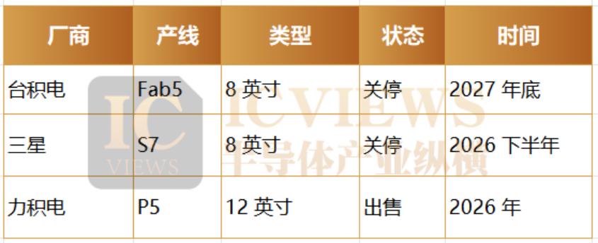 台积电同样在进行产能结构的深度调整。根据集邦咨询的预测,2026 年全球晶圆代工产业营收将增长 19%,其中台积电一家贡献约 72% 的营收。其高额投资主要用于先进制程研发、先进封装产能扩张及全球制造基地建设。新竹宝山厂已完成 2 纳米工艺布局,并规划导入 1.4 纳米工艺,台中厂也规划布局 1.4 纳米工艺,嘉义等地的先进封装厂亦需大量资金投入。然而,更具结构意义的是台积电在成熟制程上的收缩动作。该公司预计未来两年将逐步退出 6 英寸晶圆制造,并同步整并 8 英寸产能。其旗下的 8 英寸 Fab 5 预计于 2027 年底前后停止运作,6 英寸 Fab 2 亦规划于同年关闭。