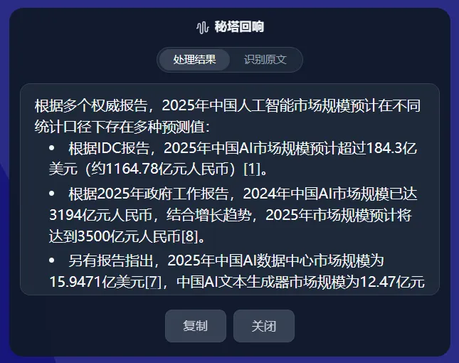 用秘塔回响,只需要按住右键,用嘴说:「帮我查一下 2025 年中国 AI 市场规模」。