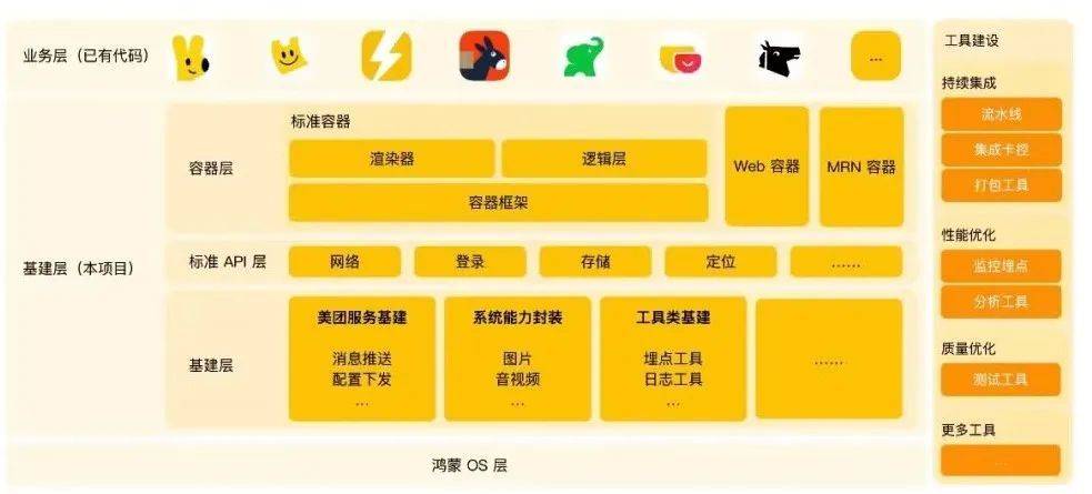 鸿蒙应用的开发,不仅需要采用华为的开发体系,还需要融合公司原本的技术架构和业务逻辑。作为复杂的商业体,美团的 APP 涵盖外卖、酒店、旅游、团购、零售等多个领域,功能非常庞大。在技术架构上,美团选择了直接从基建层面支持鸿蒙原生应用。基建层直接对接操作系统层,上层则采用容器化方案对接已有的代码资源。如此庞大的业务体系,应用开发落地必然需要比较长的周期。