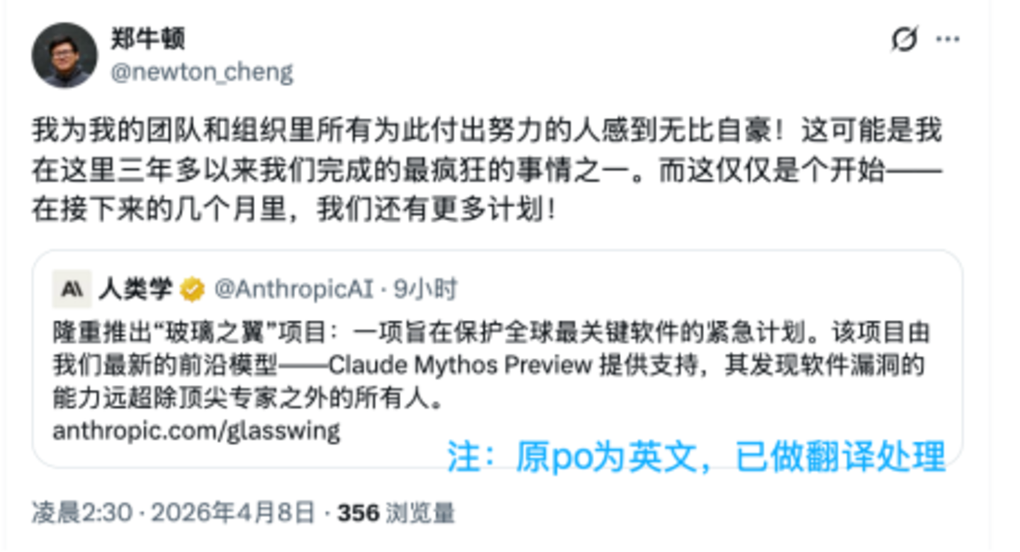 最明显的信号是,这次 Anthropic 的华裔研究员 Newton Cheng 走到台前,频繁出现在官方信息与媒体采访中,直接对外喊话:「由于 Claude Mythos Preview 的网络安全特性,我们不打算将其公开发布。」