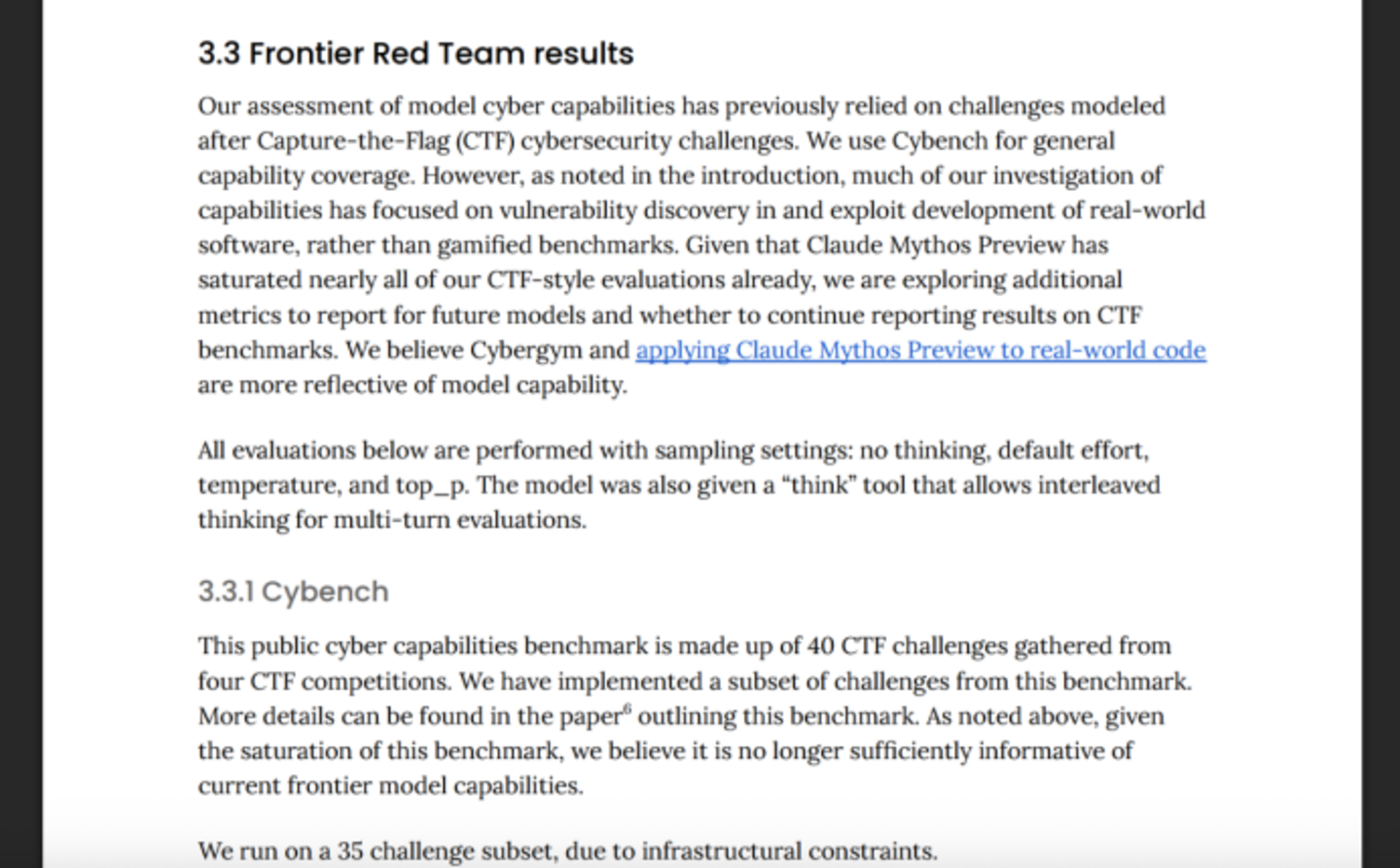 Anthropic 直接承认,这类由 CTF(夺旗赛) 挑战组成的公开网络安全基准,已经越来越不足以刻画前沿模型的能力,因为 Claude Mythos Preview 在测试到的题目上已经做到 100%。