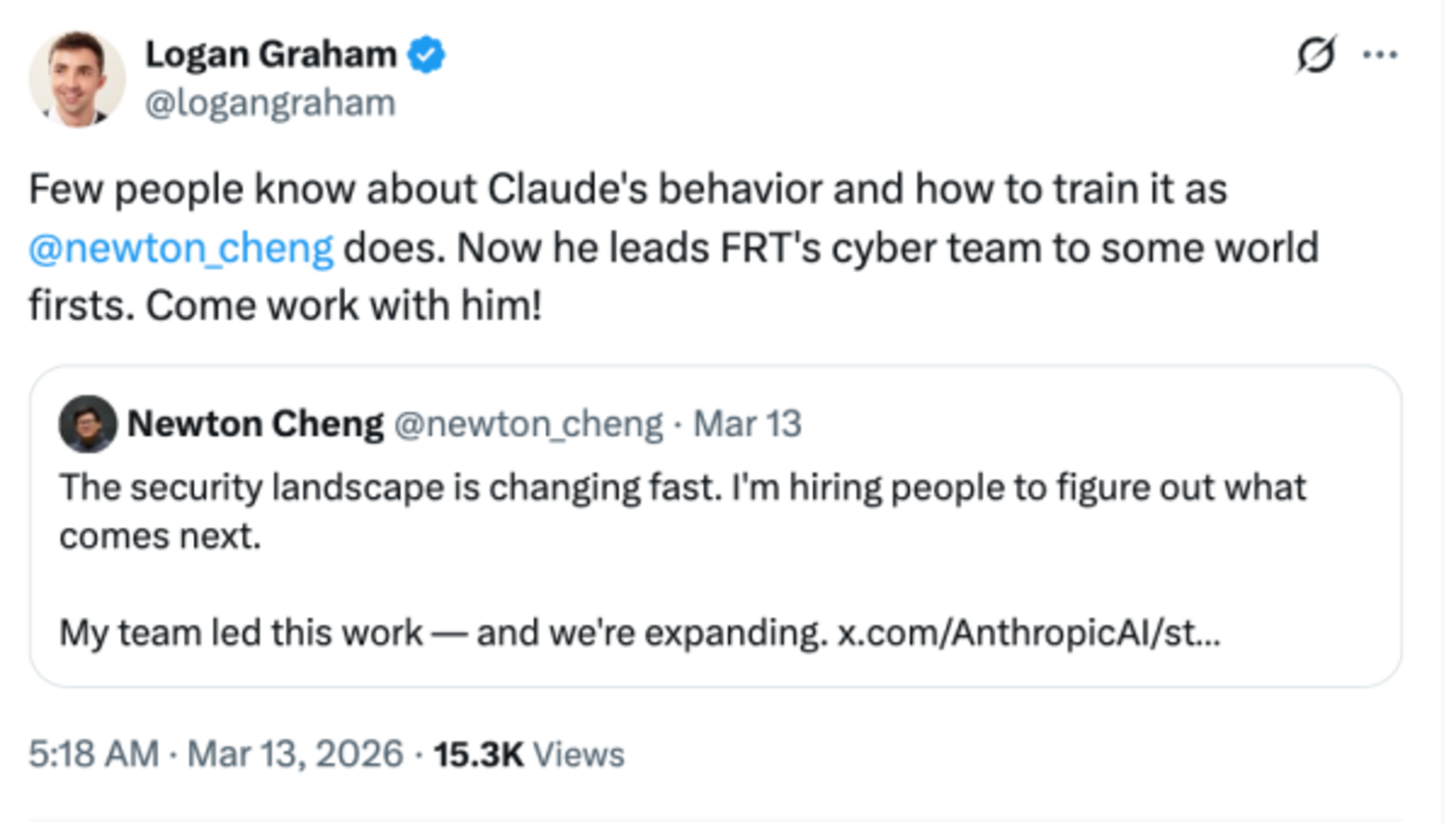 就在上个月,Cheng 还在 X 和领英上都发布团队招聘信息,Cheng 的上司 (前沿红队的头儿)Logan Graham 转发支持并盛赞: