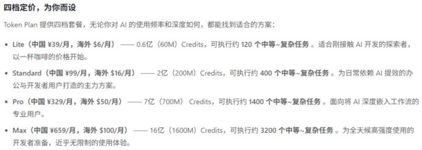 与 Coding Plan 不同的是,它不再使用以次数为限制的虚无缥缈的承诺,而是像手机流量包的配额制一样,明确告知用户一个周期内套餐中能够使用的 token 数量。