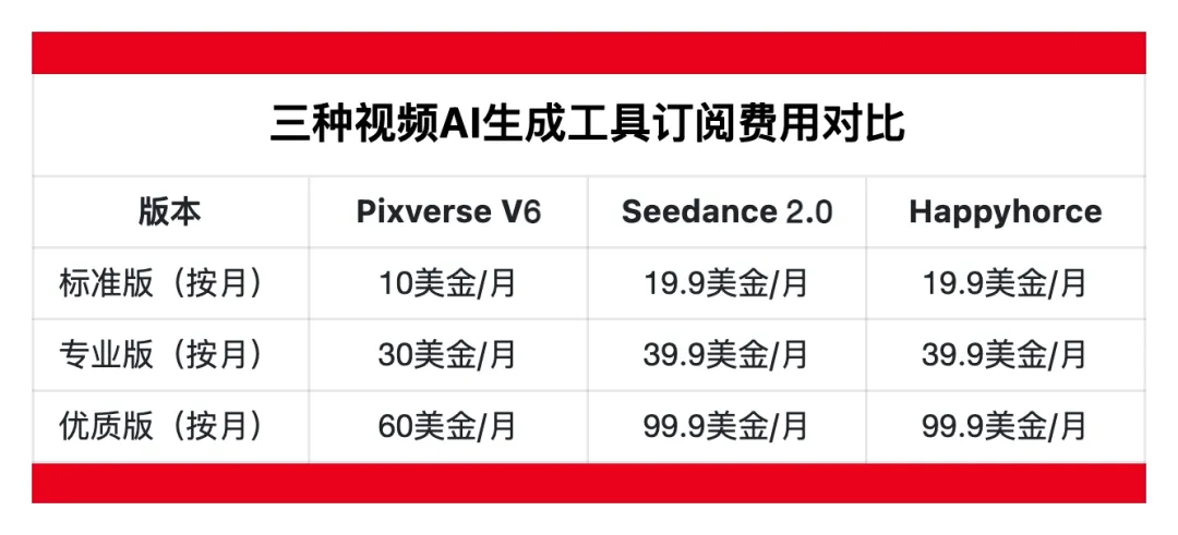 虽然网络上大家都在说它的价格比 Seedance 2.0 便宜一半,但实际上几乎是照着 Seedance 2.0 订阅价格设置的,比 Pixverse V6 定价也更高,并没有价格优势。