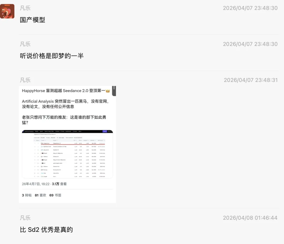 虽然关于 HappyHorse 的大多数的讨论都是自然发生的,但种种迹象表明,从故意隐藏信息制造讨论话题,到扔出折叠的聊天记录曝光,引起讨论,这完全可能是一场人为的,精心设计的传播。