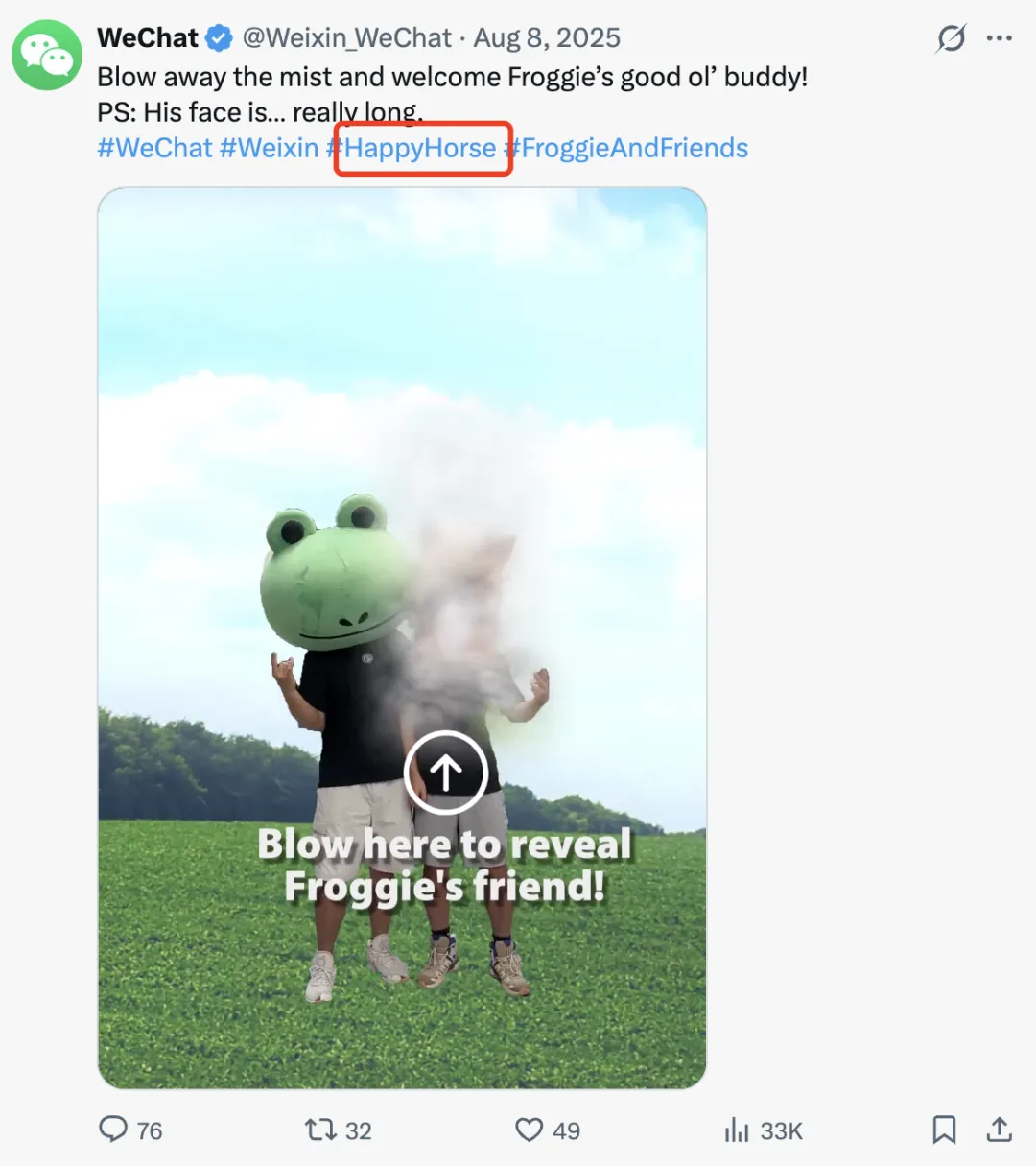 事实上,我们之前怀疑是爱诗,但沟通后对方否认了这件事情,并反向猜测可能与腾讯有关。我们后来在 X 上也找到了一些蛛丝马迹,微信曾在去年 8 月于 X 上发布过一条帖子,刻意提及 “HappyHorse” 关键词。
