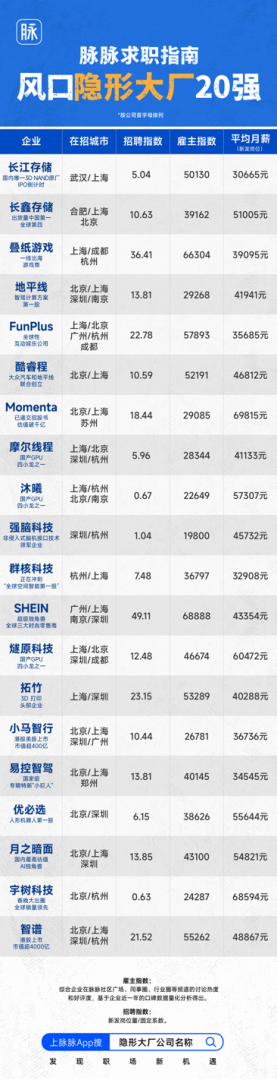 脉脉还从 80 家 「隐形大厂」 中,依据岗位增幅、雇主口碑和新发岗位平均薪资,进一步精选出 20 家高速成长的企业,形成 「隐形大厂 20 强」。这些企业集中分布于 AI、机器人、智能驾驶、芯片等热门风口赛道,既代表着当前科技产业最活跃的方向,也承载着未来更大的增长潜力。
