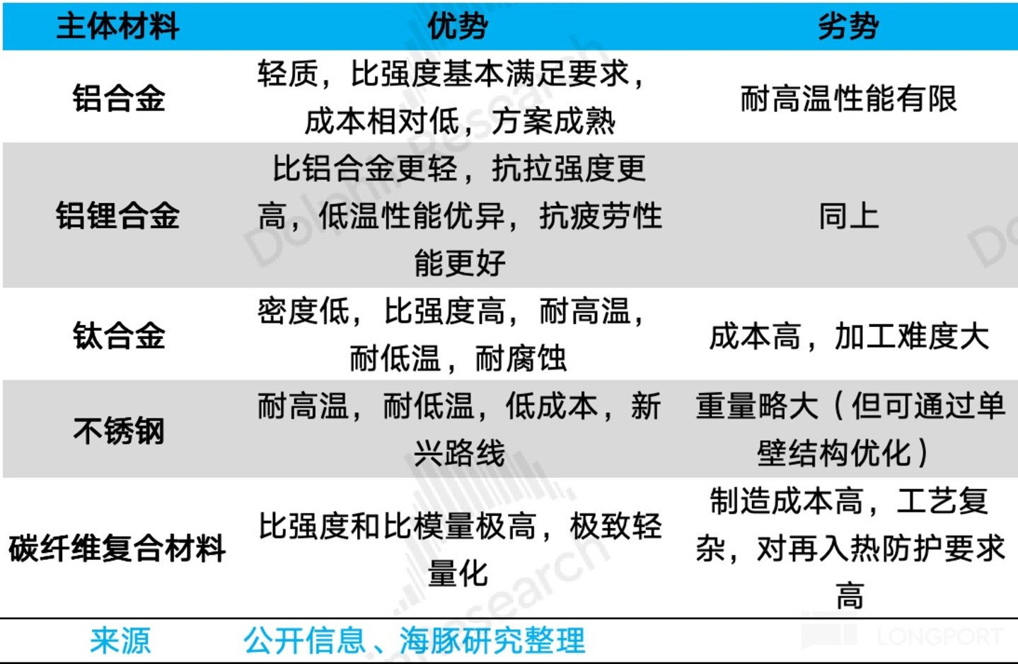 (2) 箭体在火箭上成本中占比次高,材料选择是重点考量的问题