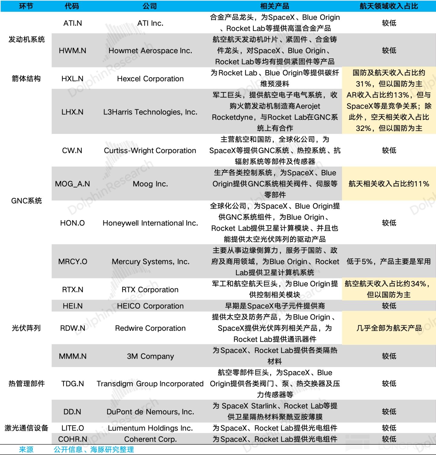 (1) 首先是火箭可回收技术及极限降本需求下,所依附的核心零部件,如发动机、箭体材料、GNC 系统、以及 3D 打印等制造技术。