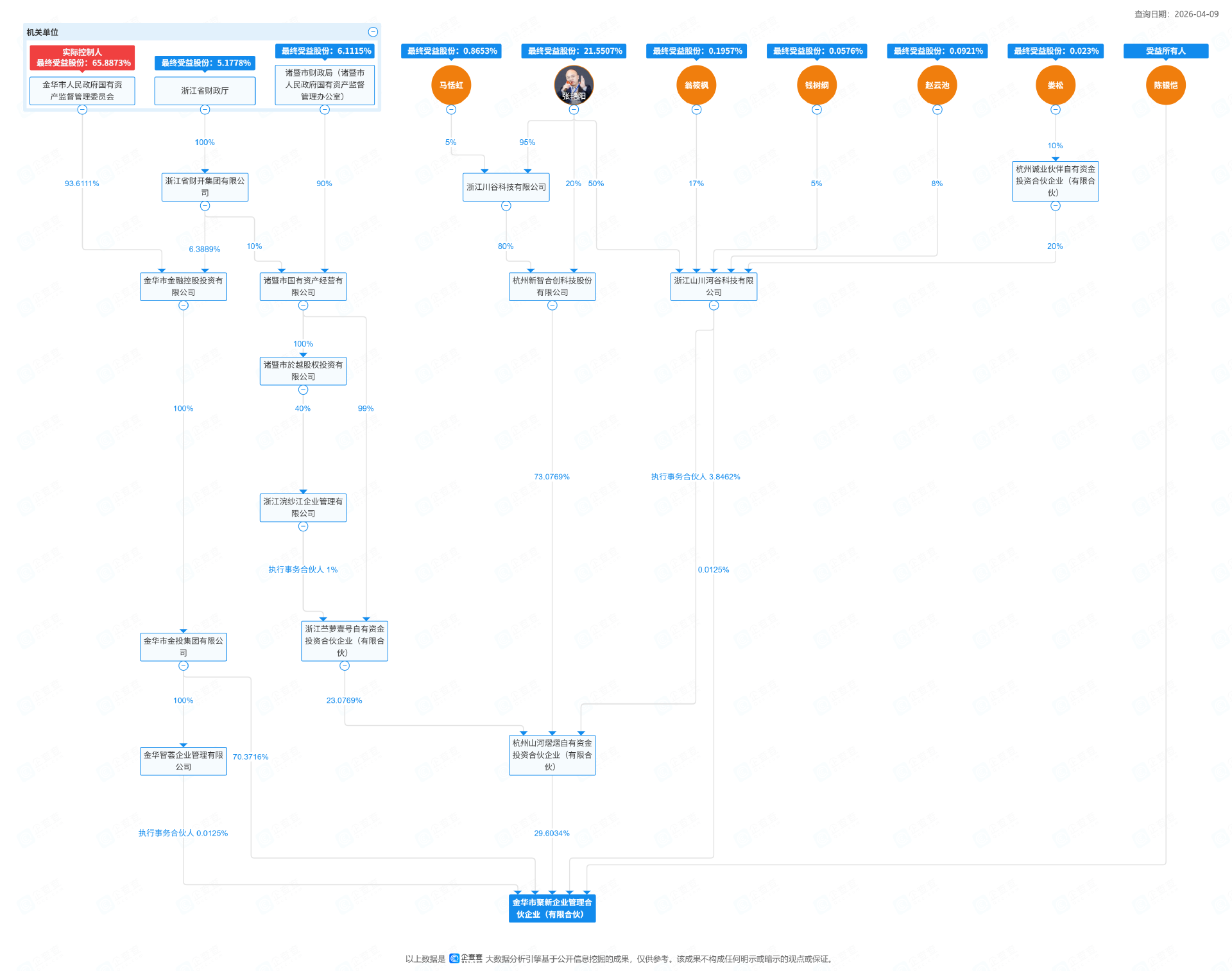 合伙人结构显示,金华市金投集团有限公司出资占比 70.3716%,为核心出资方;杭州山河熠熠自有资金投资合伙企业 (有限合伙) 出资占比 29.6034%,为财务投资方。