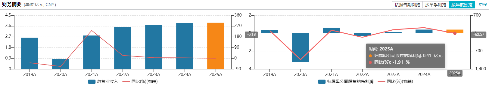 2025 年年报同样暴露了经营疲态。公司全年实现营业收入 3.88 亿元,同比仅增长 0.66%,几乎陷入停滞;归母净利润 4068.79 万元,同比下降 1.91%;扣非归母净利润 3278.58 万元,同比增长 10.57%。公司综合毛利率同比下降 5.66 个百分点至 45.53%,成本管控能力弱化。