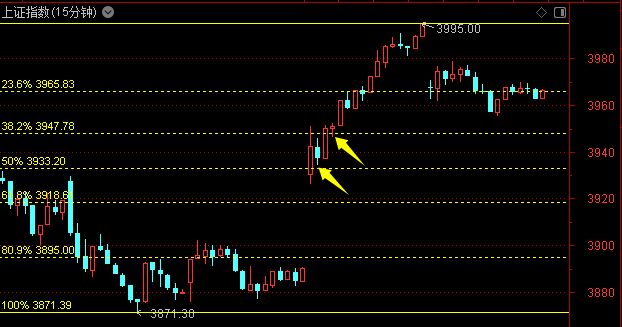 上周五至昨天的波段,其回撤 38.2%、50% 两个分位的位置,与 15 分钟 K 线图上两根 K 线的低点接近,如下图所示。