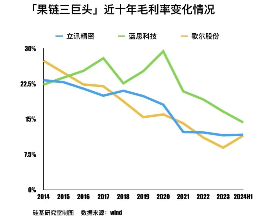 以毛利率为例,尽管今年上半年立讯精密、蓝思科技与歌尔股份毛利水平均有所优化,但横向对比过去 20% 上下的毛利水平,依旧处于历史低点。