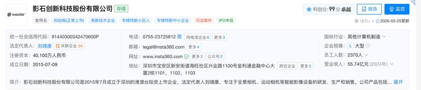 天眼查 APP 信息显示,2015 年,刘靖康创立影石。成立之初,刘靖康常亲自去工厂拧螺丝、打磨设备,他知道,做硬件 demo、被量产折磨、找融资,每个都是创业的 「生死线」。