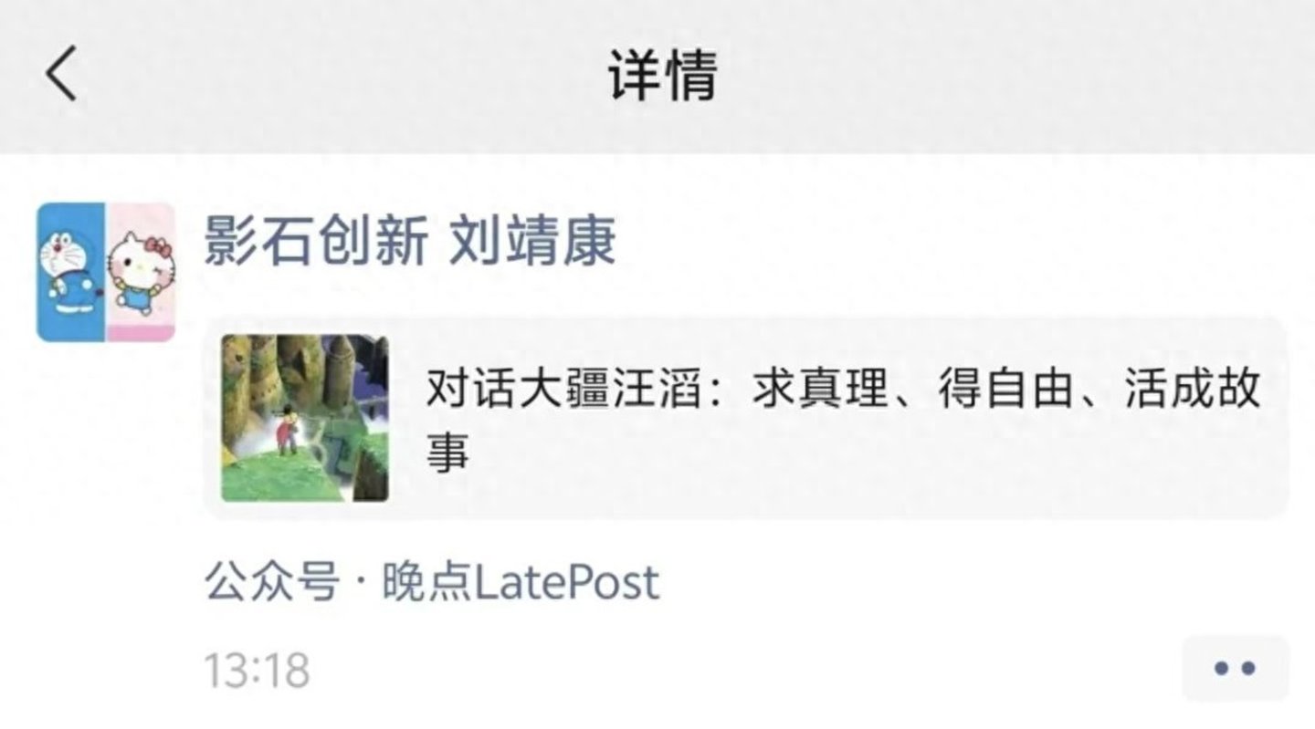 影石创始人刘靖康,也在微信朋友圈转发了晚点对汪滔的专访。