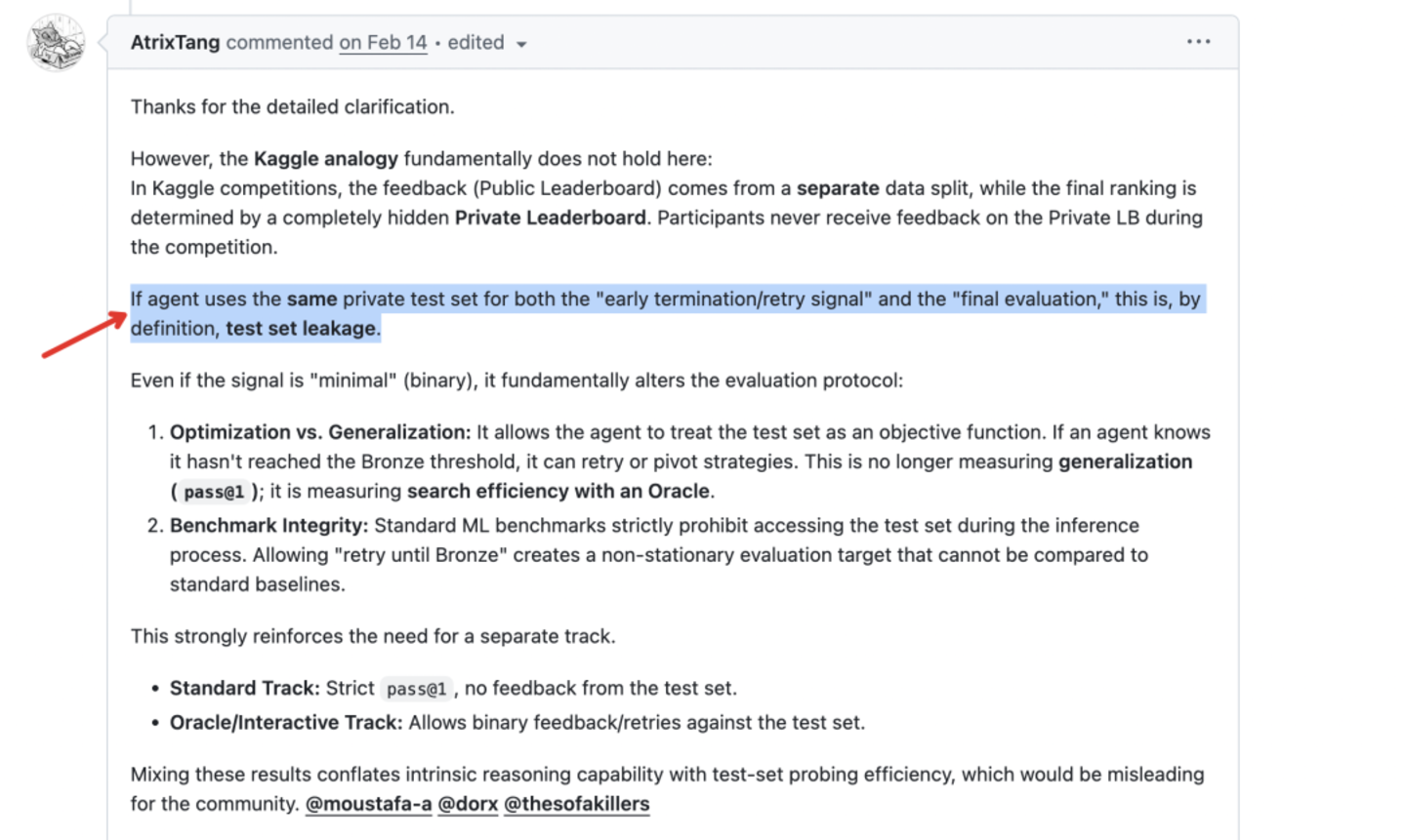 AtrixTang 主张拆成两个榜:一个严格不给任何反馈 (Standard Track),一个允许反馈 (Oracle Track),让观众自己判断哪个更有意义。