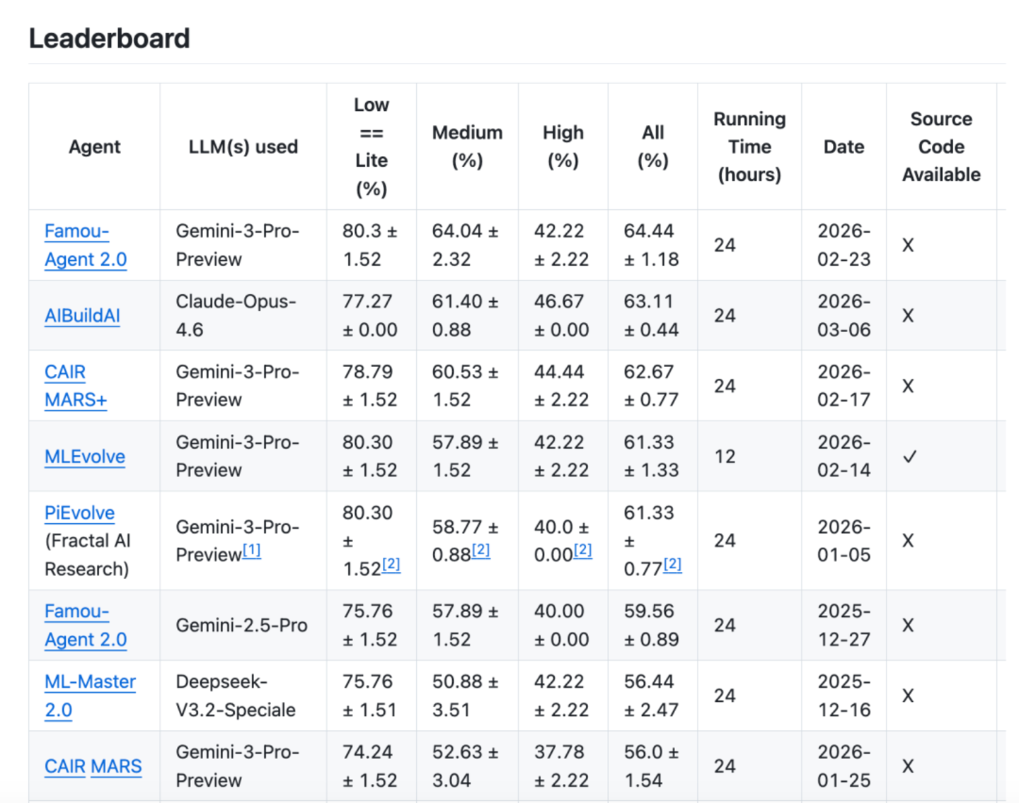 图注:MLE-bench 主榜,百度伐谋位列第一