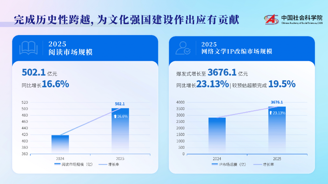 【TechWeb】4 月 13 日消息,今日,中国社会科学院发布 《2025 中国网络文学发展研究报告》(以下简称 「报告」)。报告显示,2025 年阅读市场规模达 502.1 亿元,同比增长 16.6%;作者规模达 3269.4 万人,较 2024 年新增 149.6 万人;作品数量达 4583.7 万部,较 2024 年新增 418.6 万部。