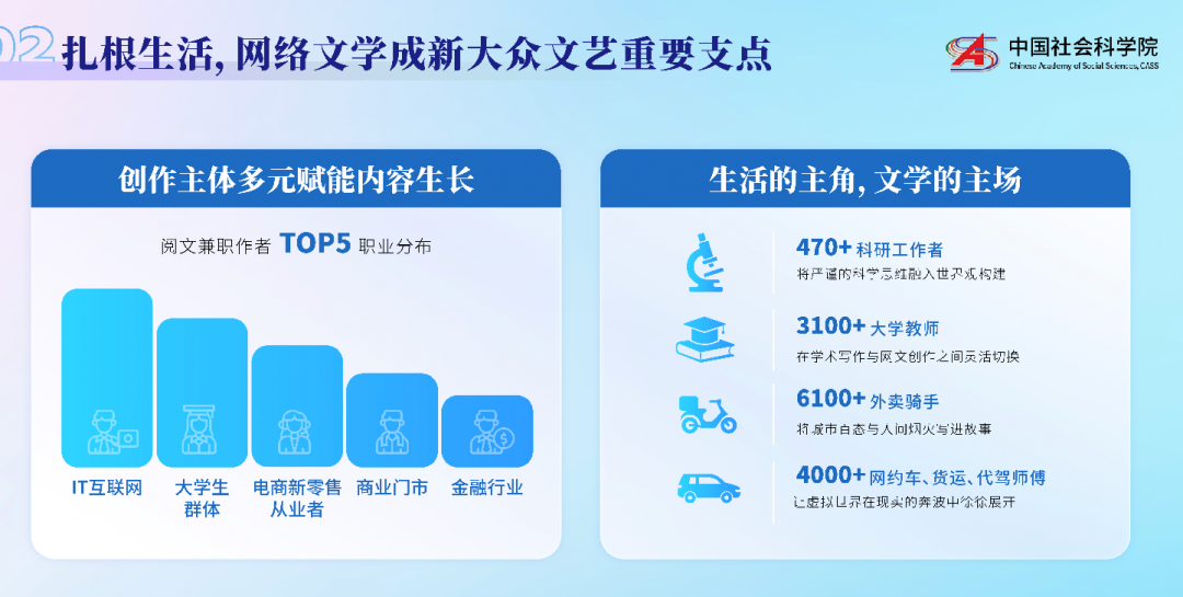 报告认为,凭借显著的参与广度,网络文学成为了新大众文艺的重要支点。以阅文集团为例,在其兼职作者行业分布中,TOP5 依次为 IT 互联网、在校大学生、电商新零售、商业门市及金融行业。